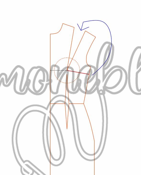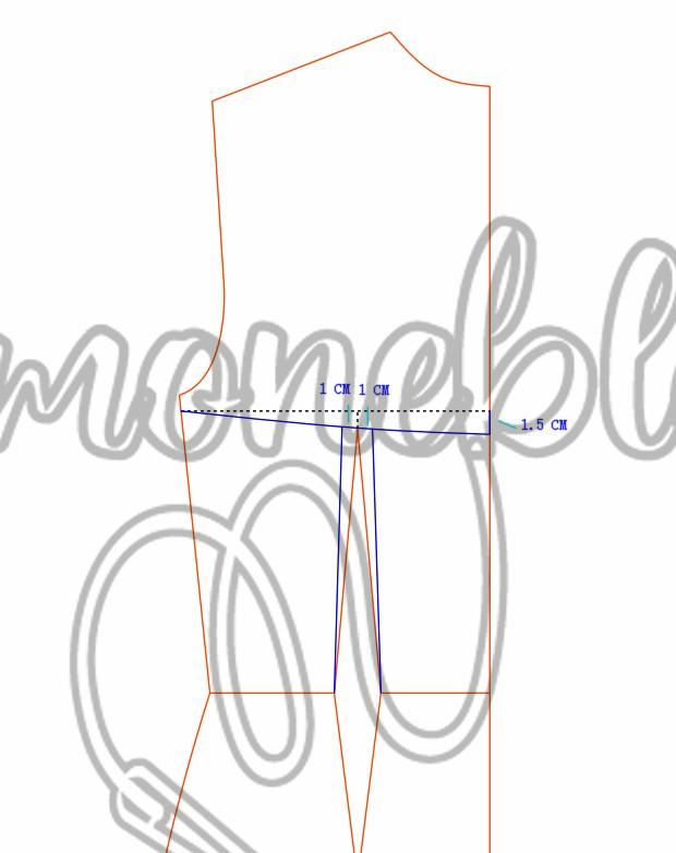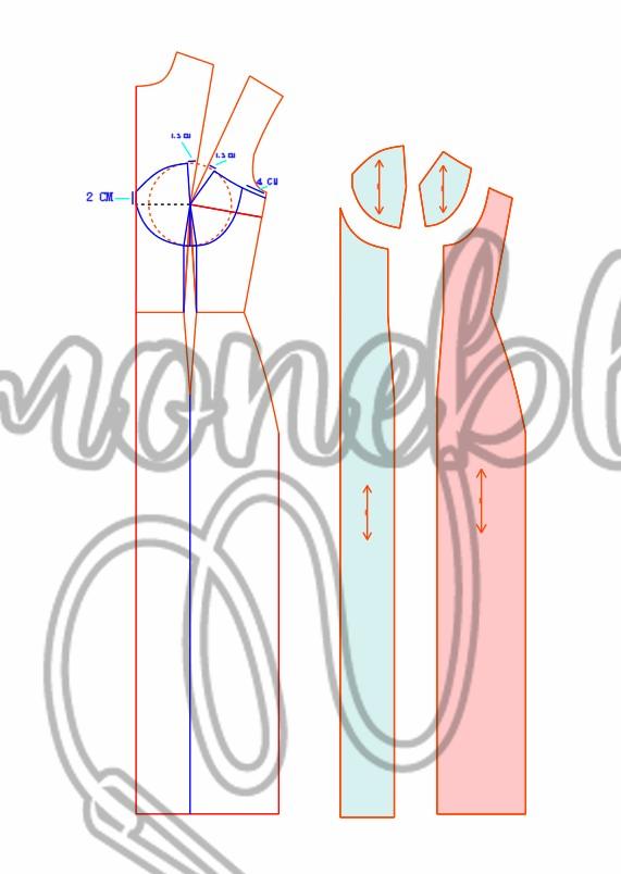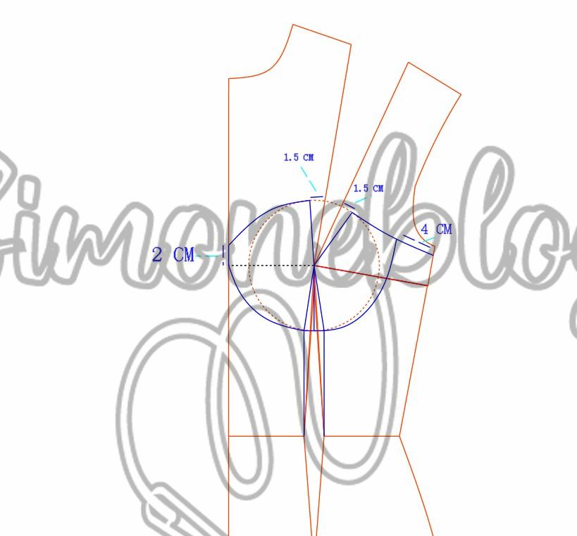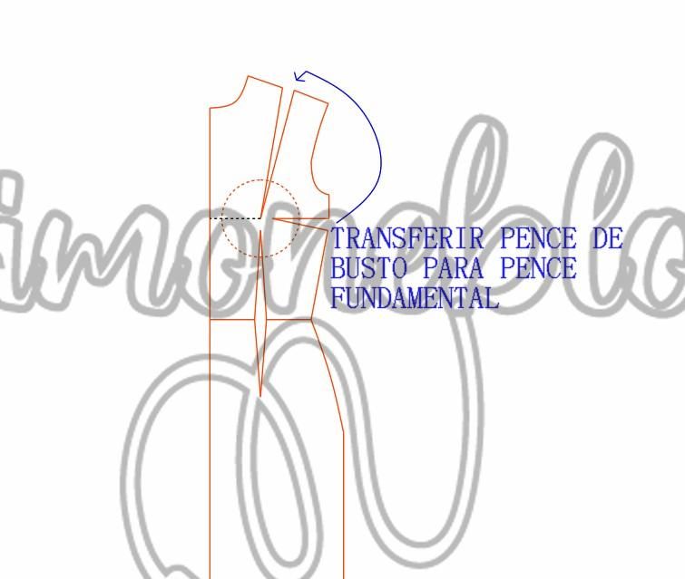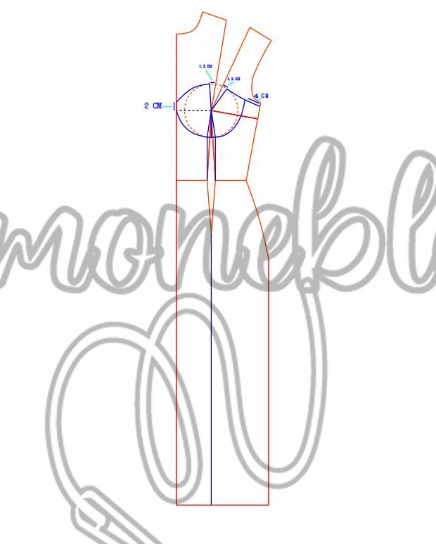 Na altura de busto subi 2 cm e para cada lado da pence fundamental dei um ajuste de 1,5 cm, no ajuste direito fiz o desenho ligando a lateral do molde e marquei 4 cm, na altura do raio do seio dei um ajuste de 1 cm para cada lado da pence, esqueci de marcar na imagem, liguei dos 4 cm até ao ajuste e do outro lado liguei do ajuste até os 2 cm.