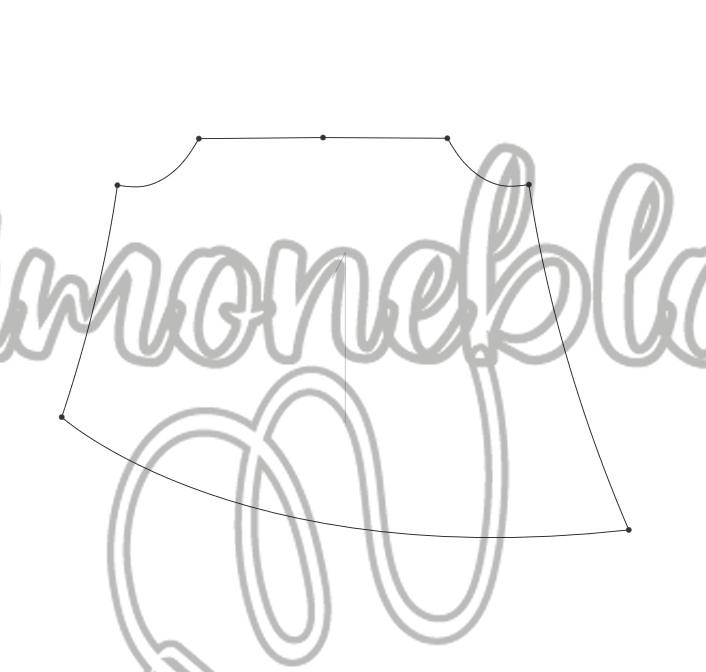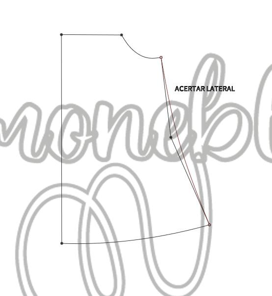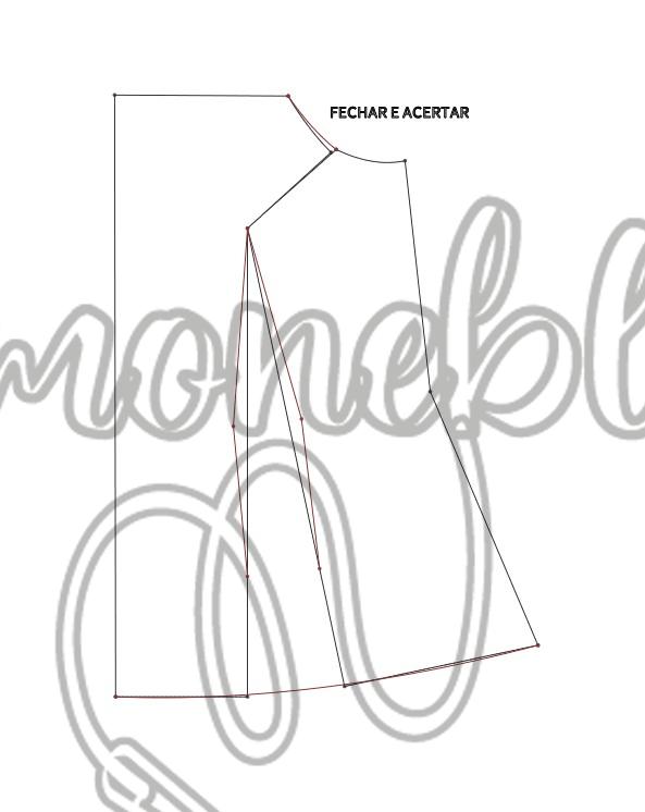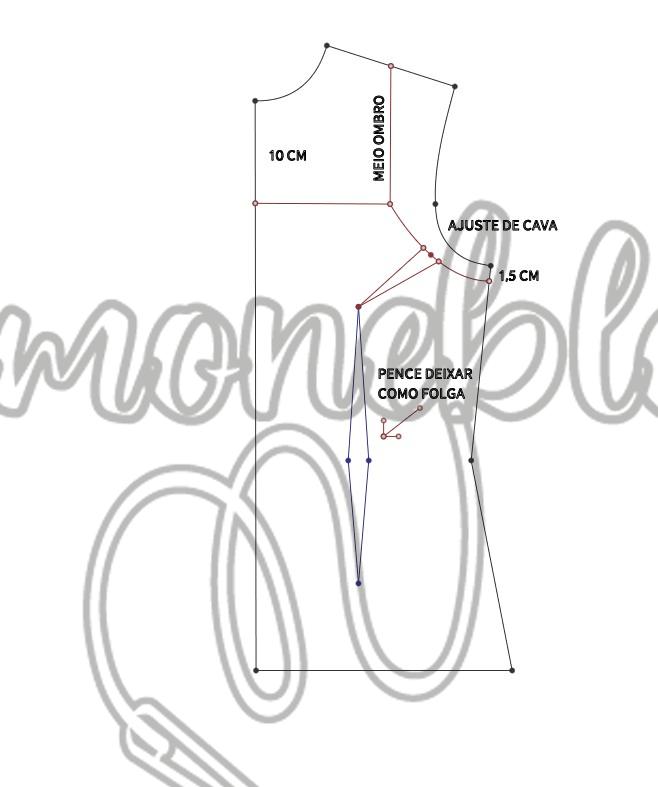 Após desfinir o comprimento, marquei a altura de decote de 10 cm, na cva desci 1,5 cm e marquei meio ajuste de cava. Marquei do meio do ombro até a altura de 10 cm para largura do decote, a pence de cintura será usada como folga.