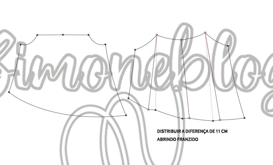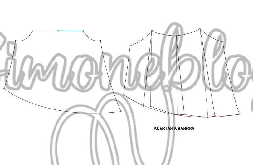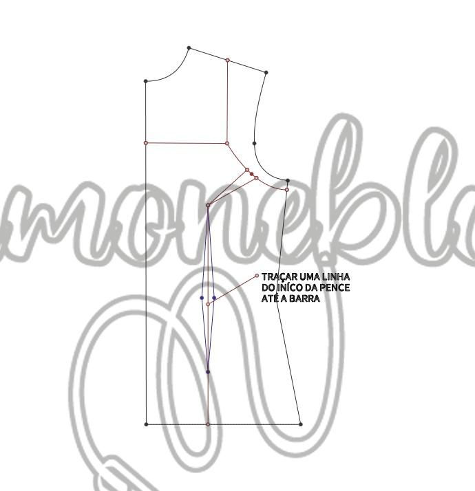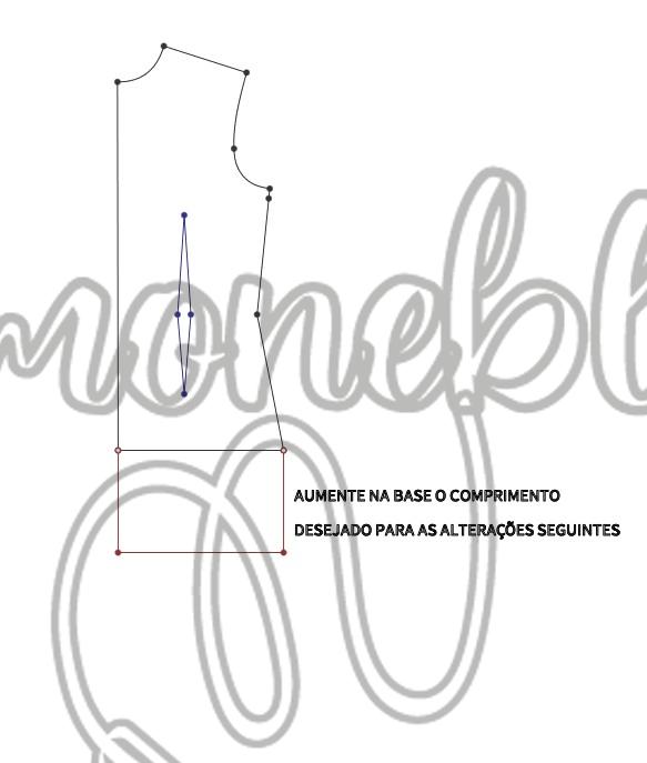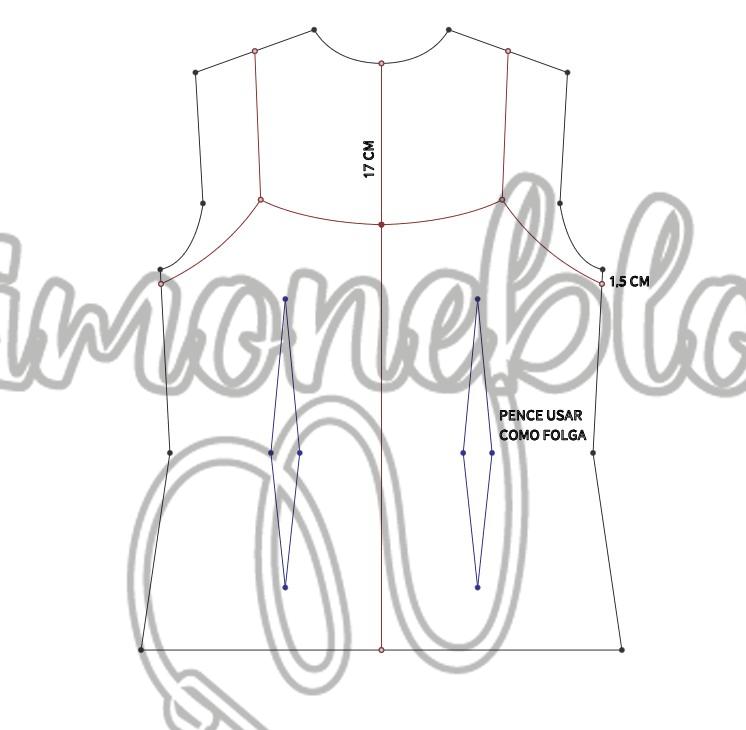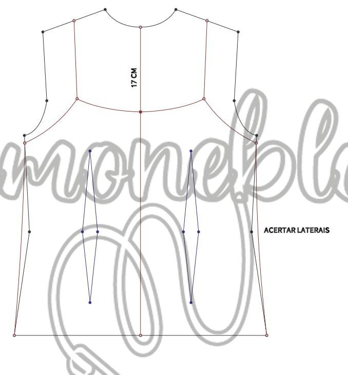 No molde costas, desci 17 cm no decote e na cava 1,5 cm como na frente. A pence de cintura também ficará como folga.