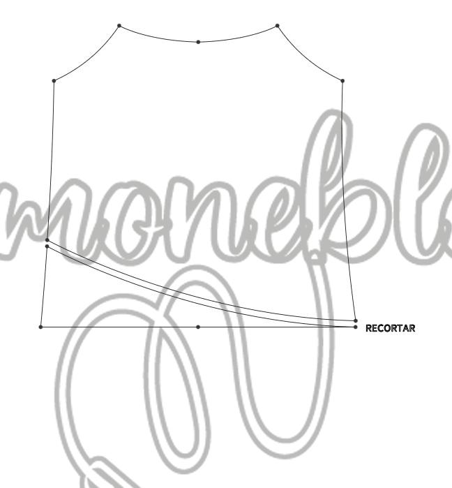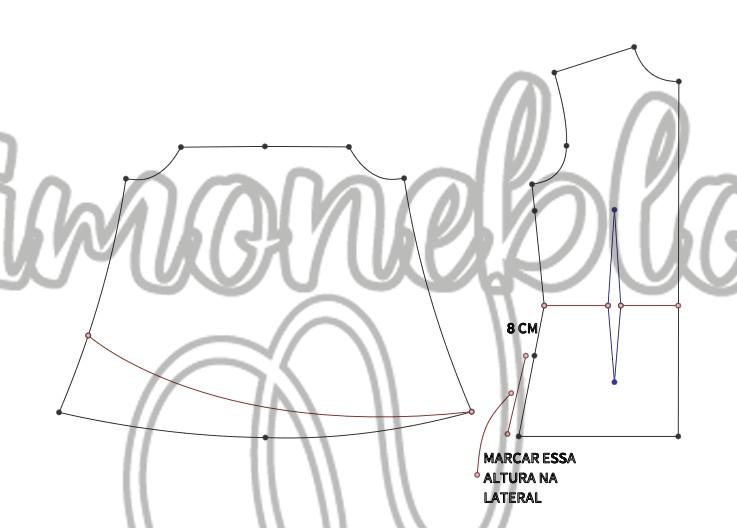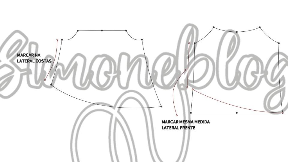 Marque a altura desejada para a assimentria de comprmentomenor, 8 cm é uma base, pode ser um pouco mais. Depois peguei essa medida e marquei na lateral costas.