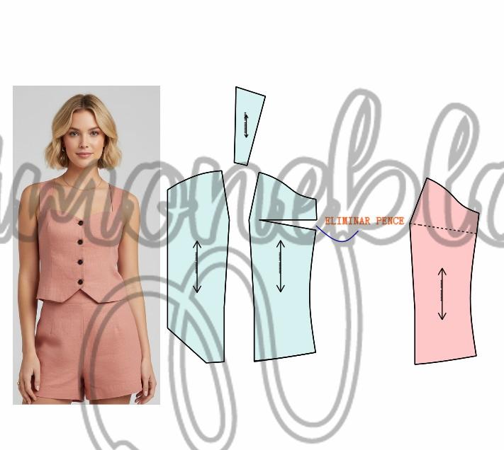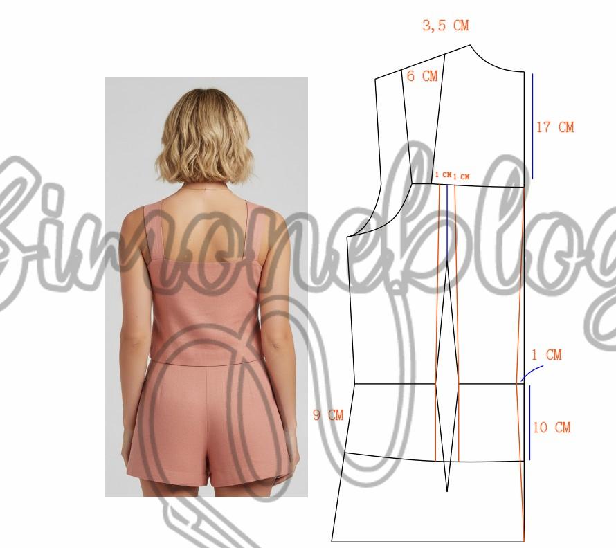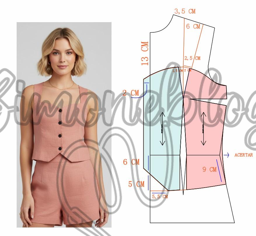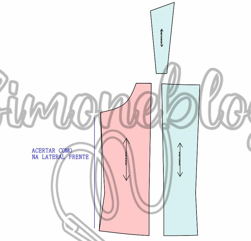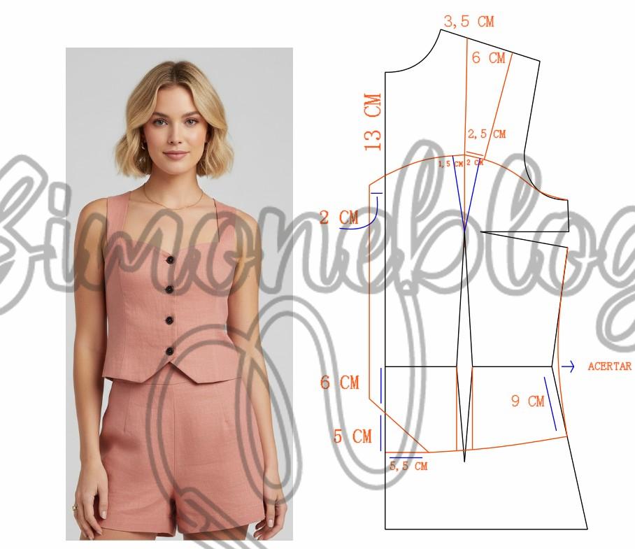 Entrei no ombro 3,5 cm e deixei a largura da alça com 6 cm, no decote desci 13 cm e marquei a vista com 2 cm de largura. Do ápice da pence desenhei uma linha até a altura do decoste e desenhei o desenho parte cima, dei um ajuste 1,5 cm e 2 cm e travei a alça na parte de baixo de 2,5 cm de largura. Da cintura para baixo marquei 6 cm, depois desci 5 cm e para direita medi 5,5 cm e liguei até aos 6 cm. Na lateral desci na cintura 9 cm e e liguei até os 5,5 cm, acertei a lateral e tracei reto da pence até a barra, onde você pode estar fechando a pence e retraçando a barra. Lembrando que as medidas de altura e larguras são todas opcionais.