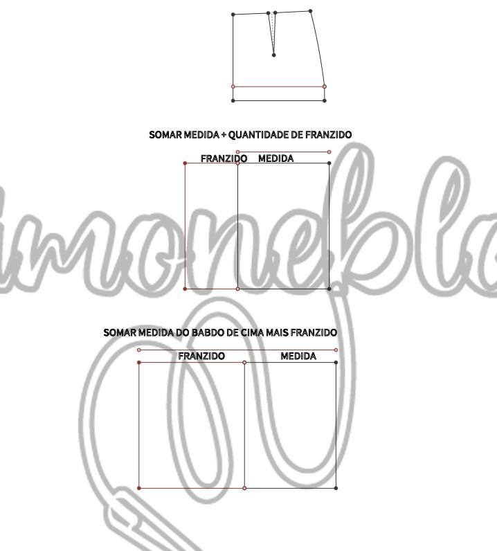 Para o franzido você marca o valor da medida que é do quadril mais a quantidade de franzido desejado, nesse caso eu coloquei 75% da medida do quadril que deixa um franzido bonito. No outro babado você irá calcular quanto deu a primeira medida e depois colocar mais 75% dess medida do babado de cima.
