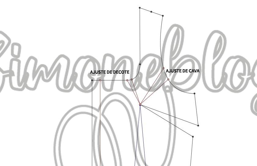 Marquei o ajste de cava e de decote, essa medidas são pessoais, na base da minha tabela foi 1 cm no decote e 2 cm na cava.