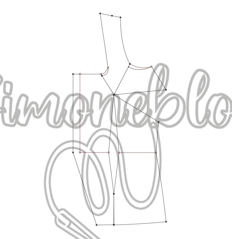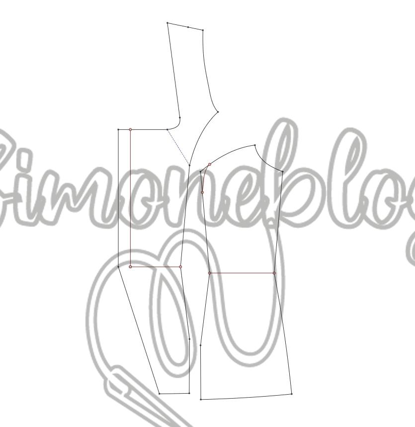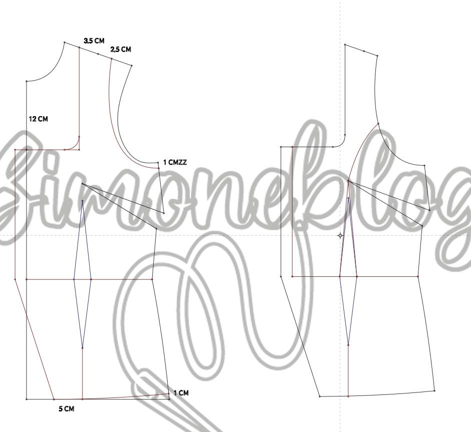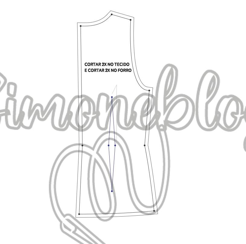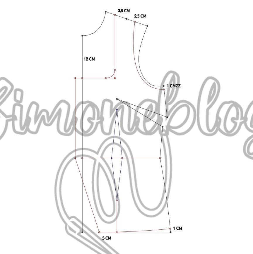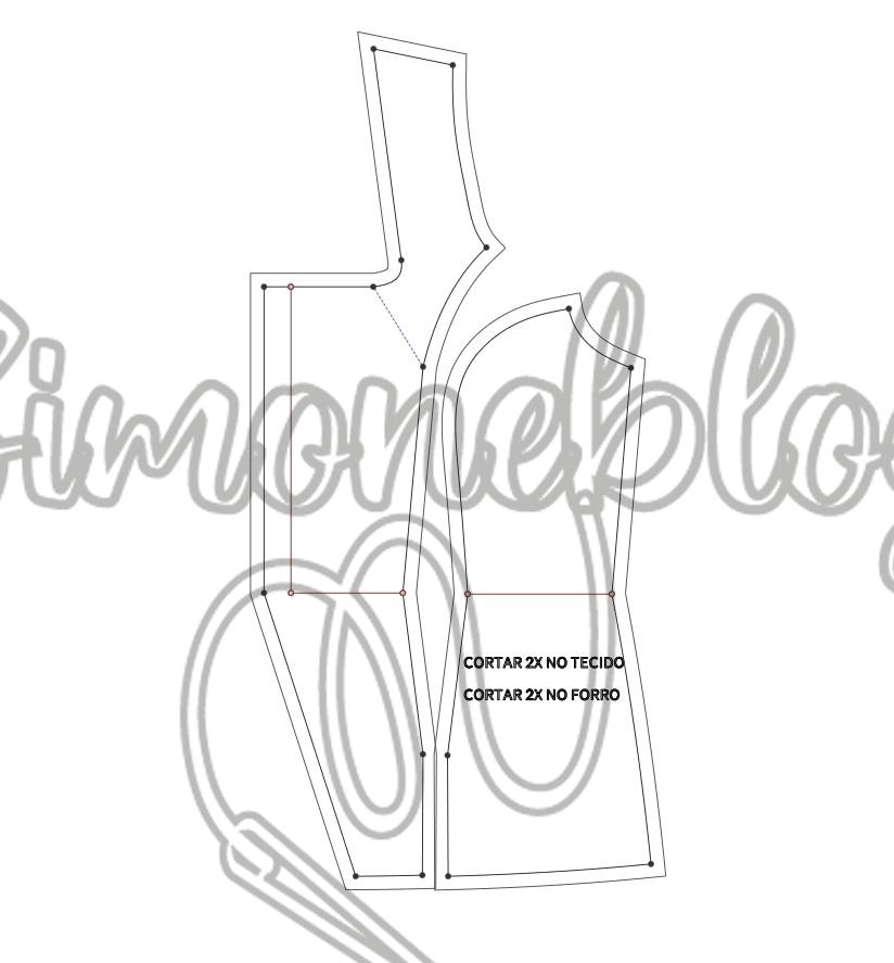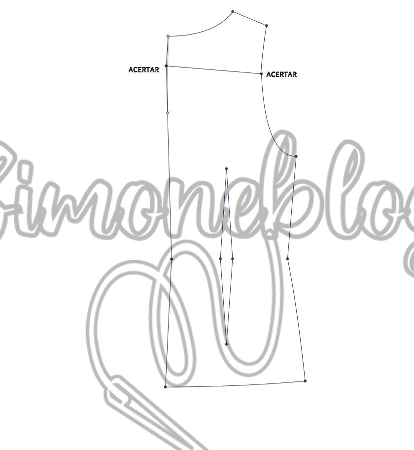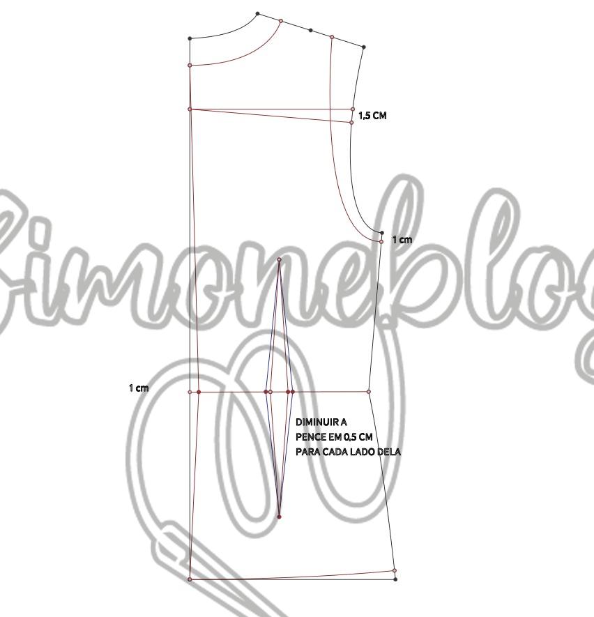 No molde costas no decote desci 3 cm, marquei o meio do ombro com um ponto e pra direita marquei 2,5 cm e para a esquerda foi 3,5 cm, iguais as medidas da frente, na cava também deci 1 cm, no centro da cintura entrei 1 cm e diminui a pence em 0,5 cm para cada lado dela para compensar os 1 cm entrados no centro costas, na barra subi e cm e acertei.