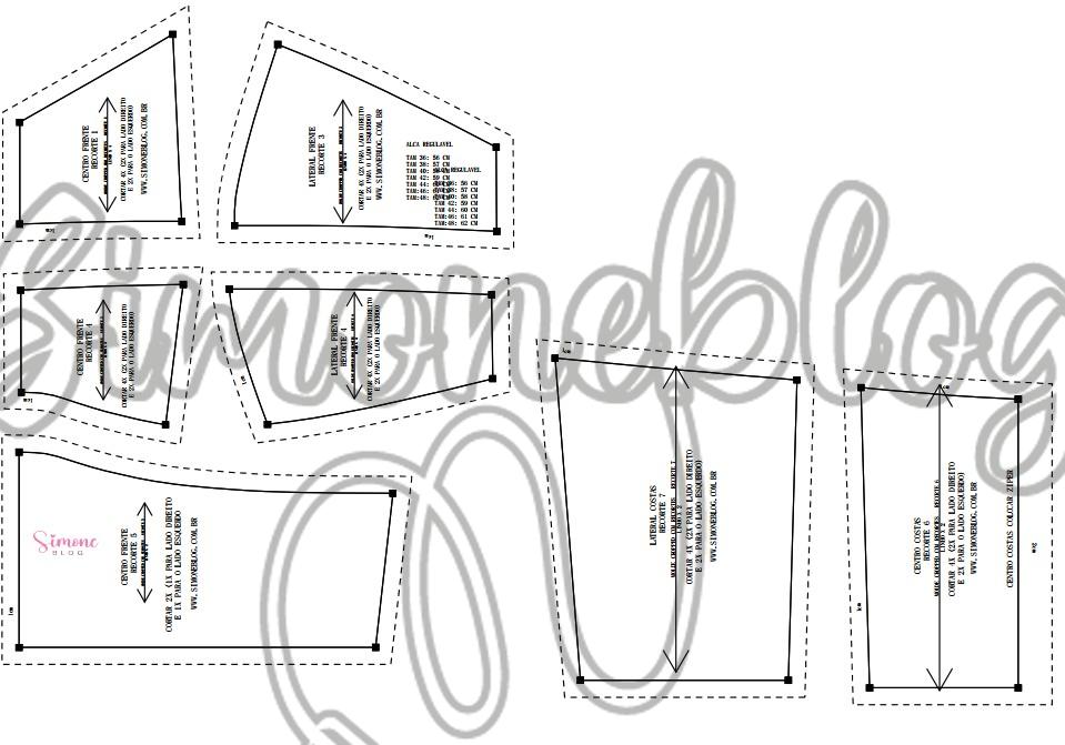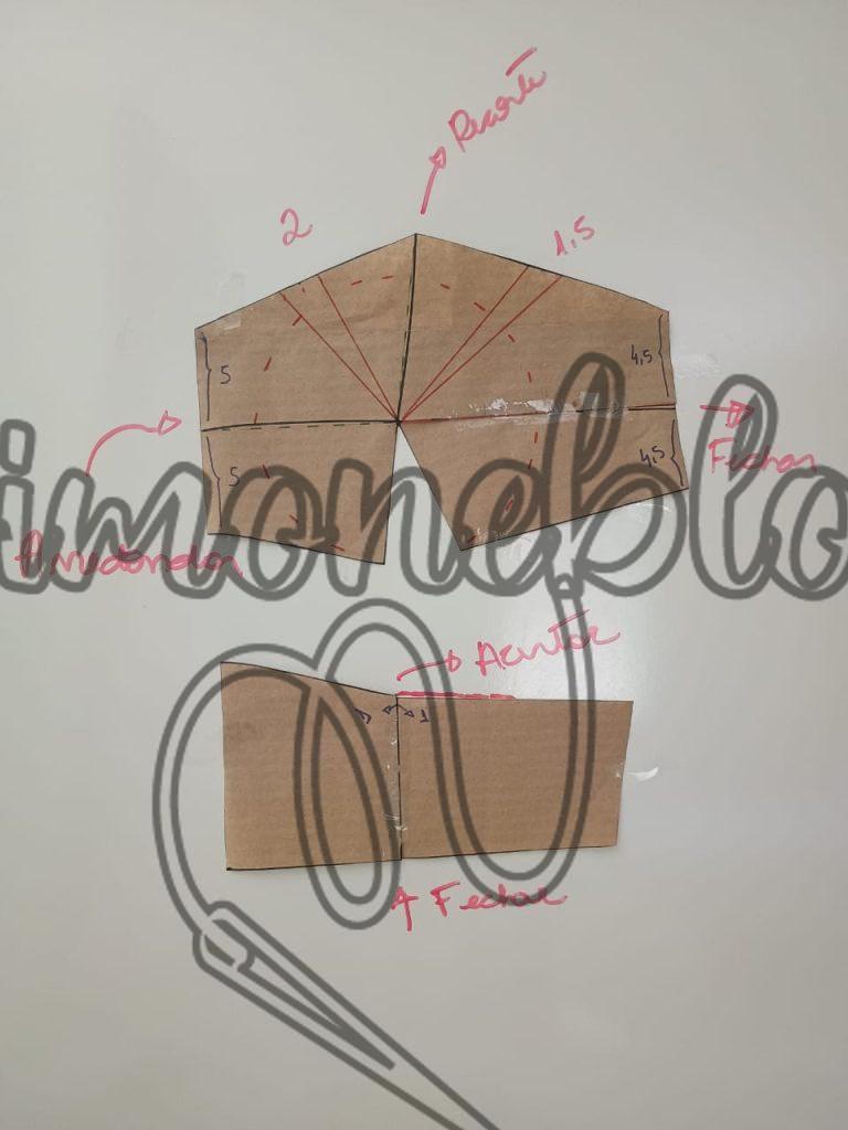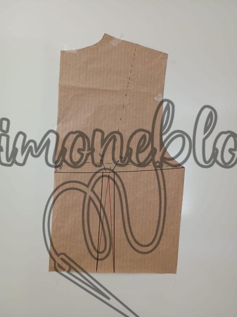Fiz o molde no papel craft na altura do busto tracei uma linha potilhada até a pence, para cima dessa linha marquei 5 cm e para baixo também 5 cm, liguei uma liha do ápice da pence até o meio do ombro. Na altura de raio de seio dei um ajuste de 1 cm para cada lado, pois minha pence é de 2 cm. Da cava para baixo mantive a altura da cava até a altura de busto que foi 4,5 cm no tamanho 38 e abaixo da pence 4,5 cm e desenhei a parte do recorte abaixo do seio, da cintura para cima subi 2 cm.