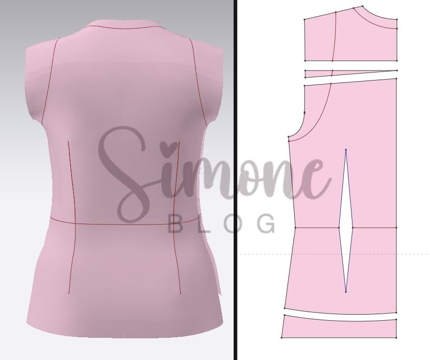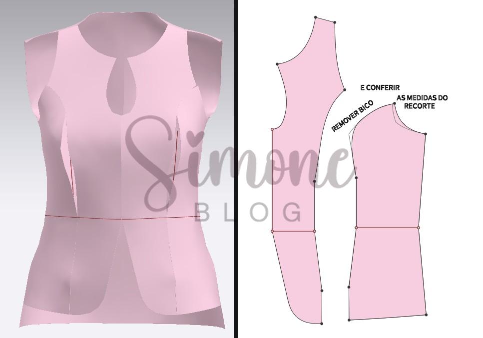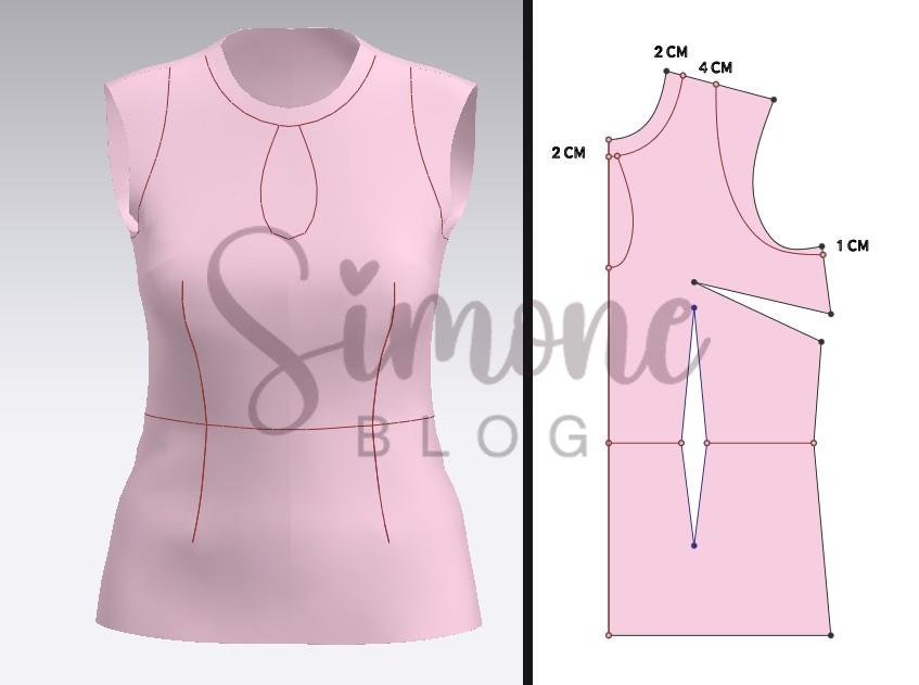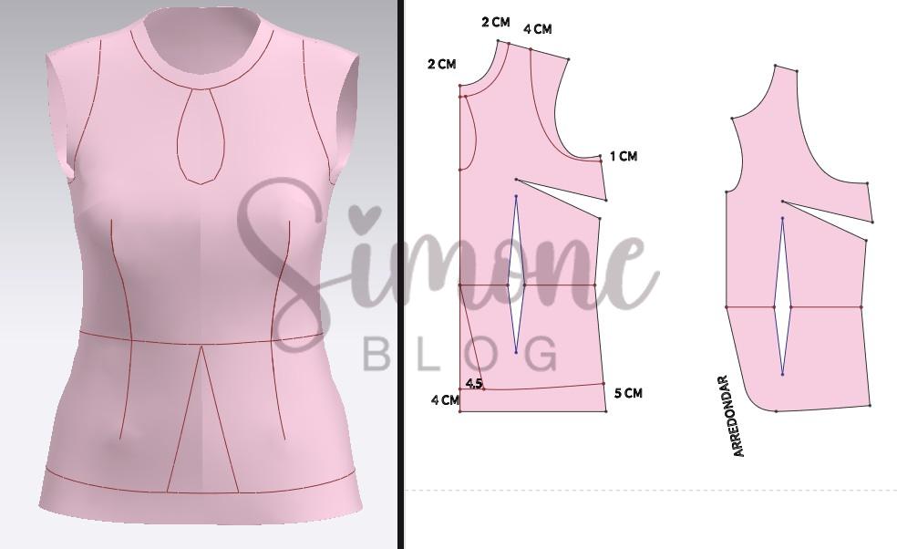 Subi do quadril para cima na linha do centro frente 4 cm e na lateral 5 cm, do 4 cm afastei 4,5 cm e liguei até a cintura e até a lateral. Depois arredondei para ficar como a blusa inspiração.