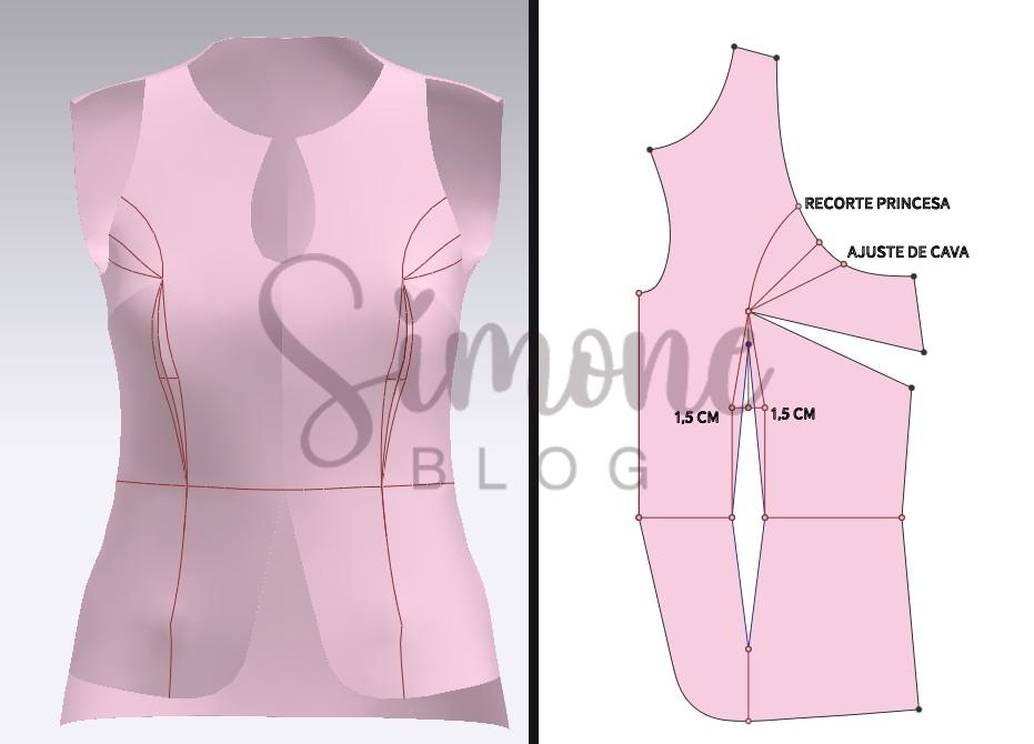 Após recortar o molde, desenhie o recorte princesa, dei o ajuste de cava e ajustei abaico da altura de seio 1,5 cm, pois estou usando uma base que tem 3 cm de pence.