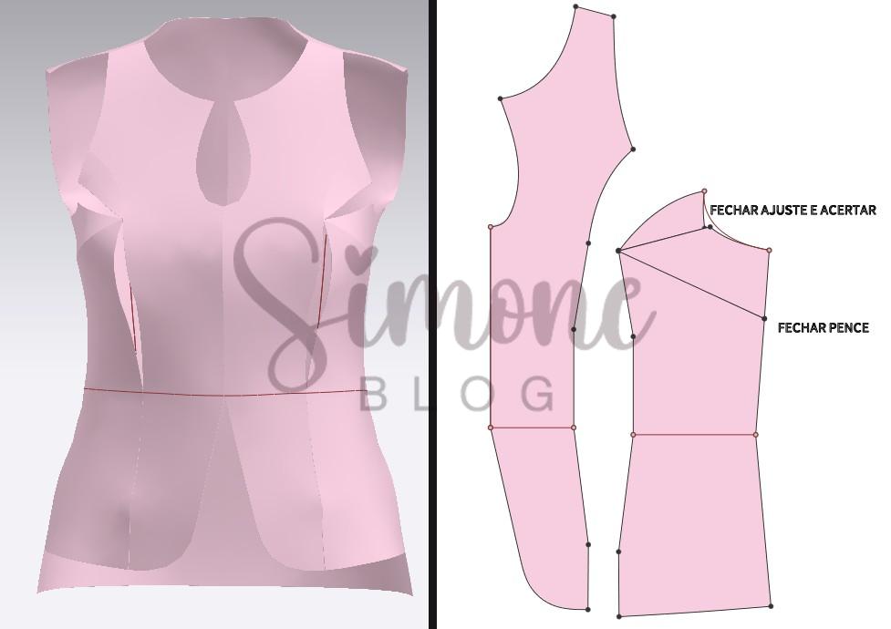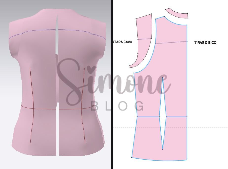 No molde costas desci 1 cm no decote, saí 2 cm no ombro e marquei a largura da alça com 4 cm igual ao molde frente, apliquei ajuste de cava nas costas, pois o método que uso sempre dá uma sobra de 1,5 cm, depois desci 1 cm na cava, no centro costas subi 4 cm e na lateral 5 cm.
