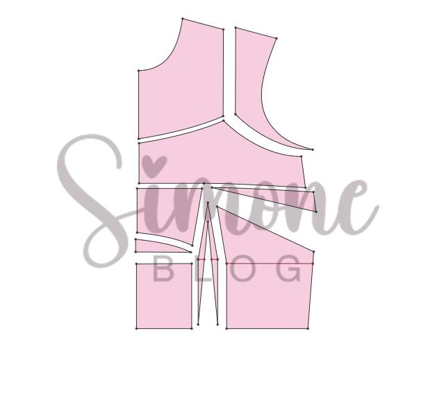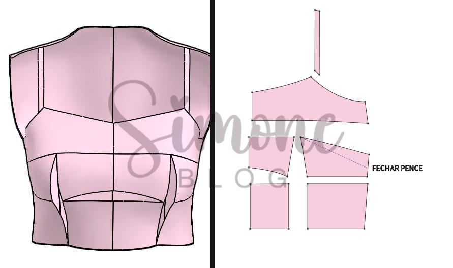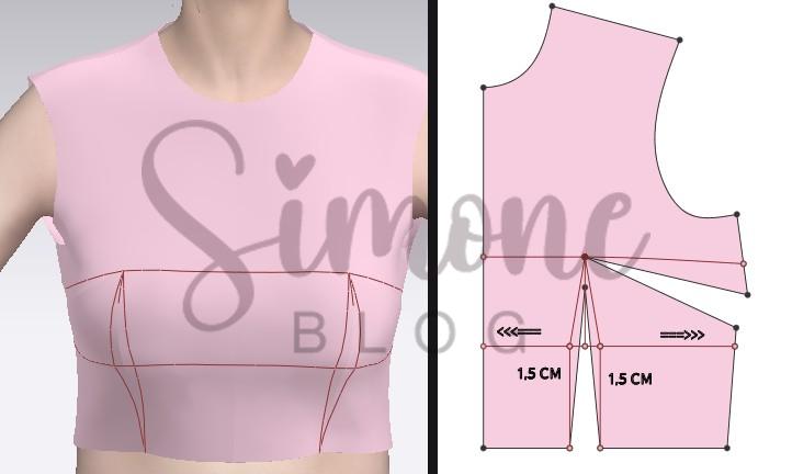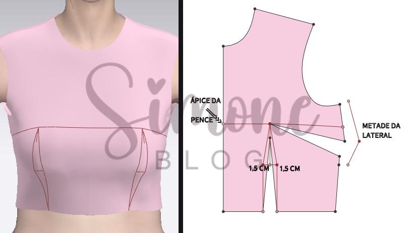 Para fazer o molde tracei uma linha do ápice da pence até o centro frente, na lateral medi a metade dela e marquei no meio essa metade ligando em linha semi curva até o mieo. Na altura de raio de seio dei uma ajuste de 1,5 cm.