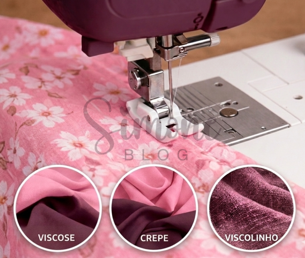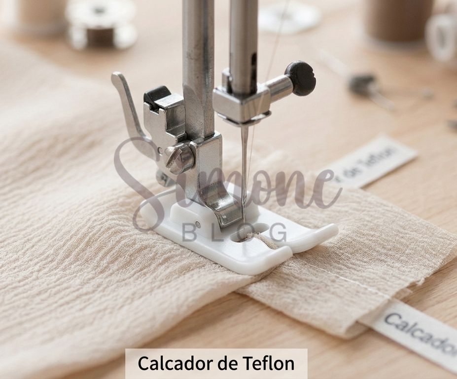 Esse acessório é excelente para costurar tecidos como viscose, viscolinho, crepe e outros materiais mais leves ou sintéticos, que muitas vezes apresentam dificuldade de deslizamento sob o calcador comum. Quando utilizamos um calcador tradicional, esses tecidos podem acabar sendo puxados ou até mesmo enrugando ao longo da costura, o que prejudica o acabamento da peça. Com o calcador de teflon, o tecido desliza com muito mais suavidade, garantindo uma costura mais regular e com melhor aparência.