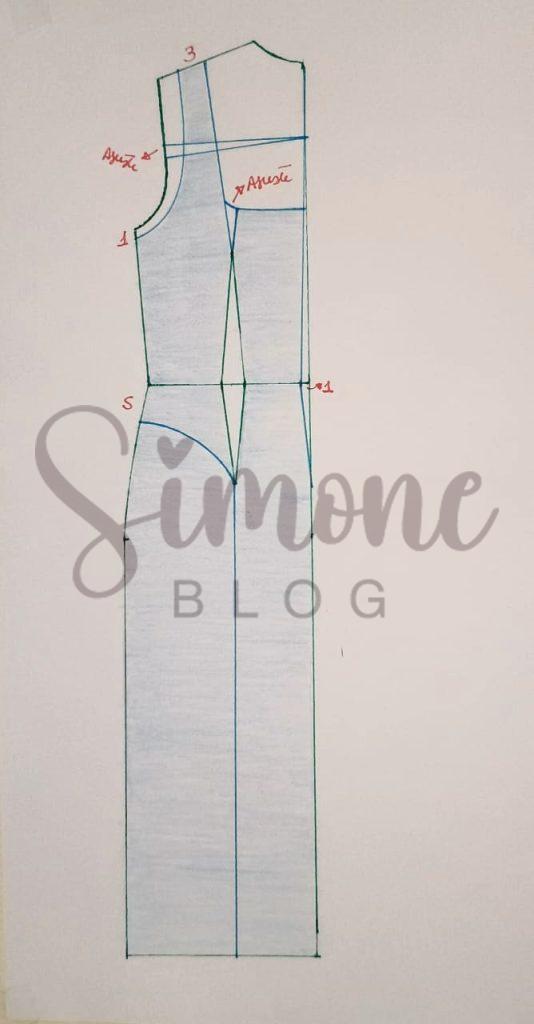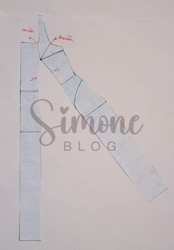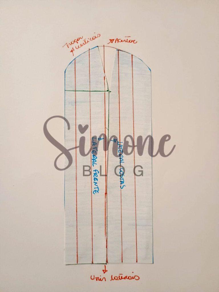 No molde costas desci na cava 1 cm, dei ajuste de cava que sobra na minha base, para cima da cava um pouco marquei a altura do decote costas, do meio do ombro para a direita marquei a alça com 3 cm. No centro costas dei um ajuste de 1 cm e abaixo da cintura marquei 5 cm, liguei em reta da pence até a barra para formar o recorte.