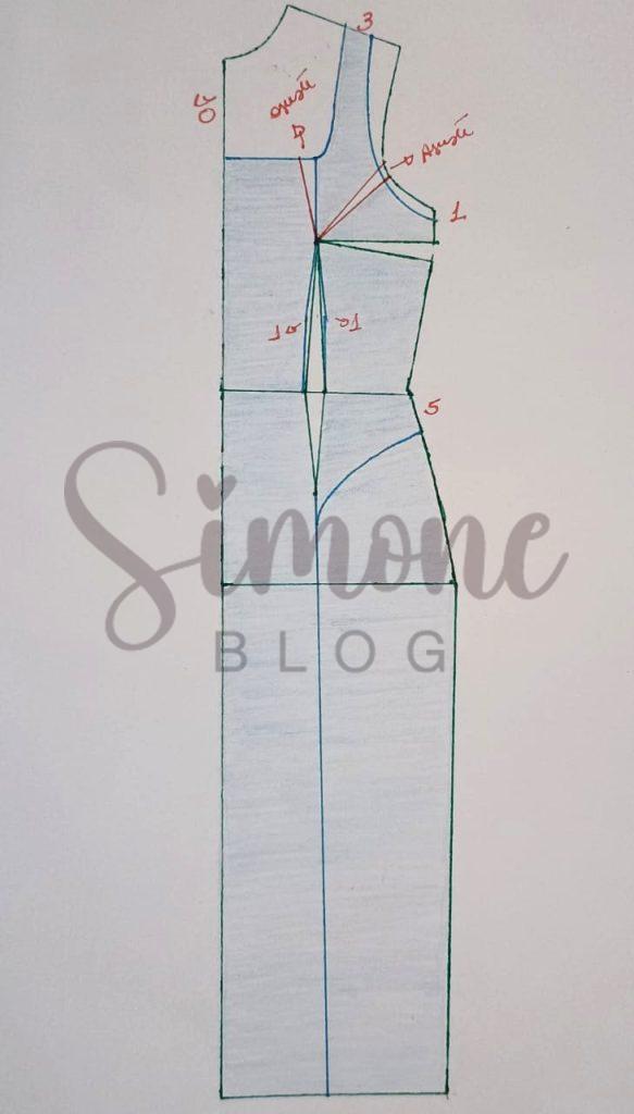 Para fazer o molde marquei a altura do meu decote com 10 cm, do meio do ombro para a direita marquei a alça com 3 cm de largura, na cava desci 1 cm e abaixo da cintura desci 5 cm, na altura de raio de seio marquei o ajuste de seio em 1 cm para cada lado. No decote há uma necessida de ajuste onde marquei na minha base 1,5 cm e na cava também dei um ajuste de 2 cm. Por fim liguei da pence até a barra para formar o recorte