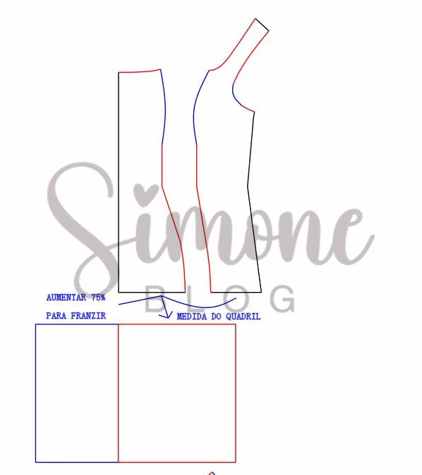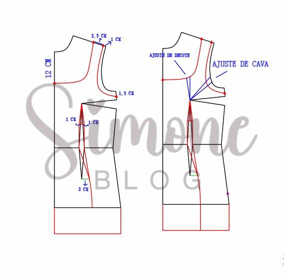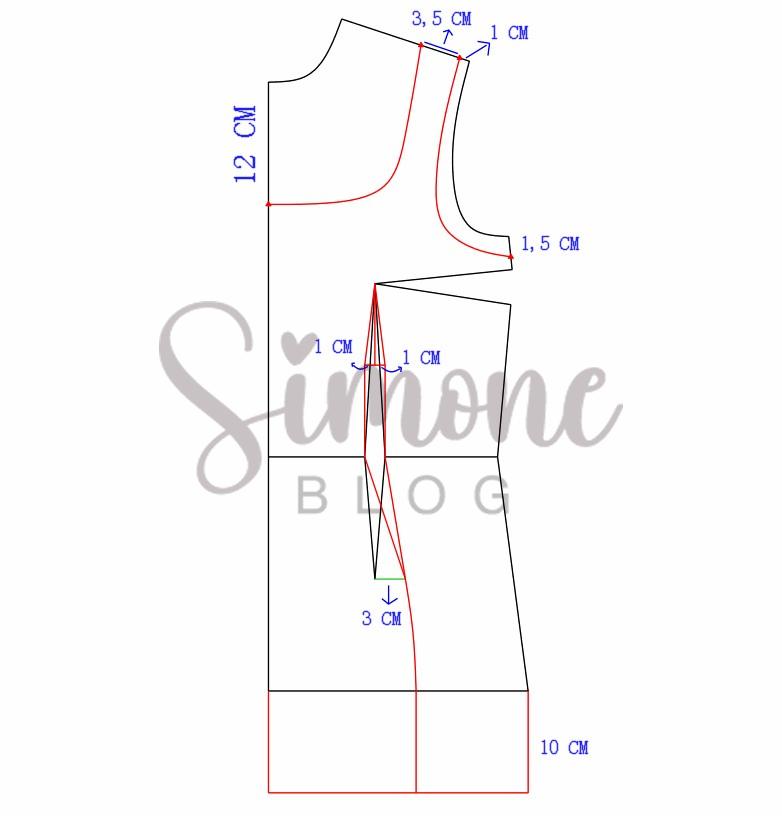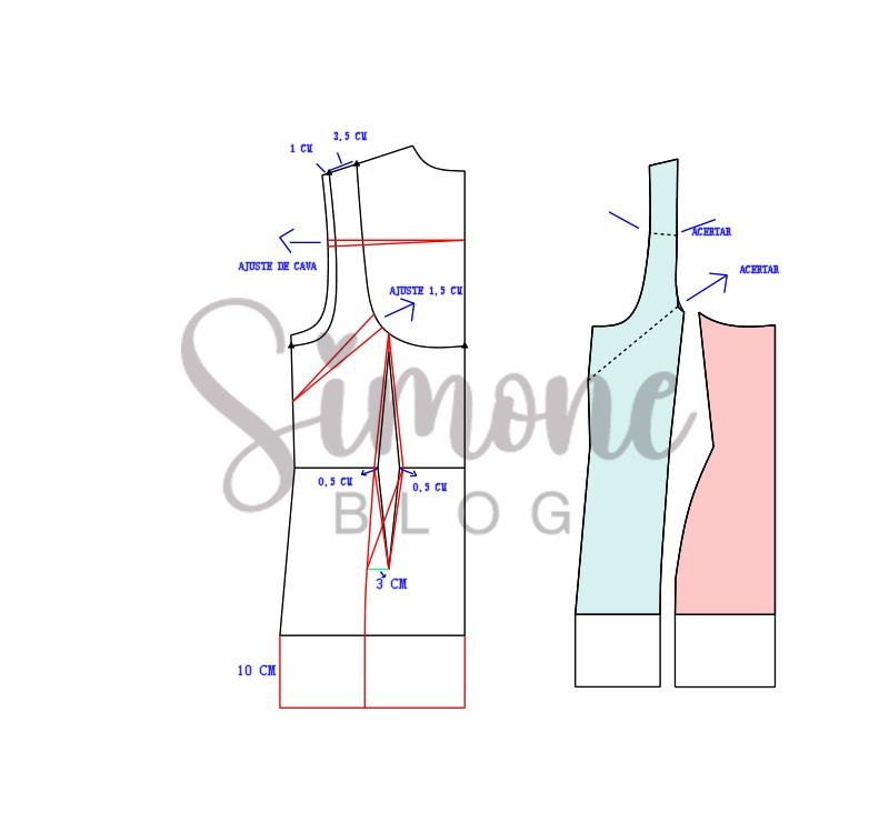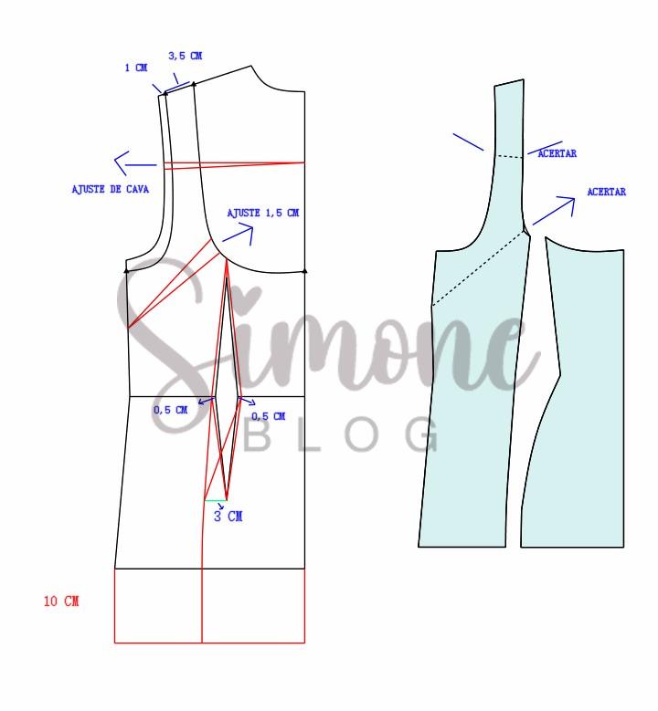 Para fazer o molde no ombro entrei 1 cm e de largura de alça coloquei 3,5 cm, na cava desci 1,5 cm porque a minha cava é bem rente. No decote desci 12 cm, na altura de raio de seio dei um ajuste de 1 cm para cada lado, saí 3 cm na altura da pence para lateral e refiz o desenho da pence inclinada, o aumento abaixo do quadril foi de 10 cm.